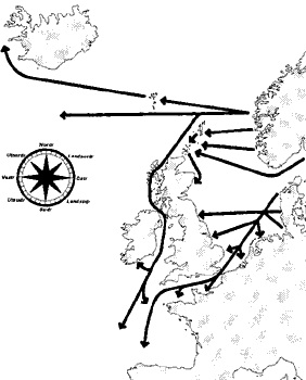 2. Halvvägs mellan Orkney och Shetland ligger Fair Isle, en viktig signalstation på medeltiden. Här tändes en väldig vårdkase för att varna Jarlen på Orkeny när shetländarna siktade den norske kungens ledungsflotta. Orkenyöarna saknar fjordar och det är ont om naturhamnar. Ögruppen är geologiskt en fortsättning på fastlandets nordöstra udde Caithness (förr Katanes). Väster om Caithness reser sig the Highlands, Sudrland, som vikingarna kallade den delen av det skotska fastlandet. Hebriderna kallades på den skandinaviska tiden allmänt i Europa för Sudreyar söder öarna räknat från Orkney. Det är en indikation på Orkneys sjöherravälde förr i tiden. Det Shetländska landskapet skiljer sig radikalt från Orkneys. Shetlandsöarna är genomkorsade av djupa fjordar med många goda naturhamnar. Några skyddade dalgångar är bördiga och nordsjöstränderna ger gott fårbete, men det mesta av landskapet består av vilda, högt belägna ljunghedar som täcker meterdjupa torvmarker. Om fårbetet är gott, så är det sämre ställt för nötkreatur på Shetland. Orkneys storhet under medeltiden baserades på sjömakt, så domineras näringslivet på ögruppen i dag av jordbruk främst boskapsskötsel. Nötboskapen från Orkney är berömd och marken är tillräckligt bördig för att ge utkomst, trots det hårda klimatet. På Shetland har fisket alltid varit helt dominerande näringsfånget. Fisket och fiskindustrin på Shetland svarar i dag för 40 procent av ögruppens bruttonationalprodukt (BNP) Till Flotta (för Flatey) på Orkney och Sullom Voe (förr Solheimvagr) på Shetland, förs det in stora mängder olja och gas från Nordsjön. För bägge ögrupperna har oljan under de senaste 25 åren haft stor betydelse. Bägge arkipelagerna hade mycket stor strategisk betydelse under 1900-talets bägge världskrig. Vid Scapa Flow på Orkney låg brittiska Home Fleets huvudbas och Shetland var centrum för norgetrafiken under andra världskriget. Från bägge ögrupperna bevakade Royal Airforce luftrummet över norra Nordsjön och delar av Atlanten. Huvuddelen av den krigsuttagna manliga befolkningen på Shetland tjänstgjorde under världskrigen i Royal Navy resten av den arbetsföra manliga befolkningen seglade i handels- eller fiskeflottan. Shetland är ett populärt mål för erfarna långseglare från den skandinaviska västkusten, men man bör undvika segla till öarna om man inte förstår sig på tidvatten. Tidvattnet rusar särskilt kraftigt, bl.a. runt södra udden av Shetland, Sumburgh Head (förr Svinborgarhofdi), där Aframax-tankern Brent förliste för några år sedan. Skrovet är nu helt sönderbrutet och har av stormarna dragits ut på djupt vatten. Av 80 000 ton olja blev det ingen miljöskada. Naturen svalde skrov och last utan biverkningar. På Shetland och Orkney är banden starka med Norge. Ö-borna är medvetna om att deras språk är bemängt med gammelnorska ord och i biblioteken finns metervis med norsk litteratur på originalspråket. Klimatet är hårt på vintern. Stormarna drar med full kraft över öarna och bromsas upp först när de når Skandinavien. September och maj är goda vädermånader och då har de flesta turisterna rest hem eller så har de ännu inte anlänt. Öarnas rykte om väder är egentligen oförtjänt. Det är sällan frost och vädret kan gott jämföras med det på västra Skandinaviens västkust. Klimatet är dock något varmare eftersom de är omslutna av Golfströmmen.