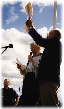 | Vad lång den är, den kust vi kallar svensk, oändligt lång från Bohuslän i väst till Haparanda i nordost. Och vill man gå med kavelbud per båt från hamn till hamn längs vägen får ta sig tid. På fastlandet har brådskan blivit lag, men havet har ju alla sina grund och strömmar i behåll, så där krävs lugn och eftertänksamhet av skepparna, en takt som även passar svenskarna på land när de ställt om till sommartid och lunkar ner mot bryggorna till fots. Längs denna kust har människorna rott och seglat, fraktat gods och landat sill i flera tusen år, längs Nordsjön som längs Östersjön, fast sillen österut döpts om till strömming. När det stormade som värst flöt vrak iland. När det var krig flöt stupade land. Och när ett skepp kom lastat under medeltiden in till en av Hallands hamnar råkade dess råttor föra med sig digerdöd, en pest som drabbade var tredje svensk. Men det var ännu flera svenskar som för hundra år sen led en sådan nöd att de tog kärran ner till Göteborg och Karlshamn för att emigrera till Amerika. Idag har strömmen vänt. Nu kommer fattigt folk från Asien och Afrika hit upp med samma dröm om välgång, men det verkar nästan som om vi glömt bort att våra förfäder en gång var svartskallar i USA. De kustbyar ock fiskelägen som nu lever högre på turism än förr på fiske eller sjöfart drabbas dock betydligt närmare av en urban och nyrik invasion av storstadsbor som driver priserna på sommarhus med sjöutsikt så högt att bofast folk får flytta bort från stranden. Det är svårt att värna hembygdskänslan när kommersen styr på detta sätt Och det är inte lättare att varna den när de som stiftar lagar stiftar dem allt längre bort från Sverige, och när gift från jordbruk och fabriker strömmar ut i havet och tar död på fisk. Men just när det är särskilt svårt att värna hem- bygdskänslan är det särskilt viktigt att slå vakt om den. Just då! Men hur ska det gå till? Det vet man redan i de kust- samhällen där man börjat ta sin sak egna händer. Orter som har dömts till döden lever upp på nytt när folk som bor där rustar upp gemensamma lokaler, startar egna företag, miljösanerar, framför hembygdsspel, får fart på tynande föreningar eller slår larm så att det hörs till Stockholm. Vad är det som behövs just här? Det är det bara ni som vet som bor just här, ni som blir kvar när vi far vidare till nästa hamn. Budkavlens enda bud är att nationers hälsa mäts lokalt. Där minsta by har liv är landet friskt. | Göran Palm läser manifestet vid Budkavlarnas ankomst till Galärvarvet, Stockholm. |