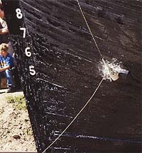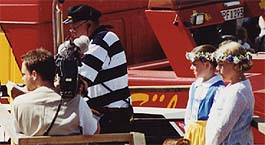Skeppets gudmödrar väntar på sin uppgift att döpa briggen. Kenneth Bognesand, föreningens ordförande och tillika speaker förbereder ceremonin. -Ska dom aldig sluta prata? Det är pirrigt att stå och vänta... Äntligen! Flickorna får säga de klassiska orden: Ditt namn ska vara Gerda - Gefle! Må lycka och framg... nej, välgång följa dig på de sju haven! Flaskan klarar första smällen, välklädd som den är, men andra svängen fullbordar dopet! Namnet är nu officiellt och namnskylten kan avtäckas. Forts --> |