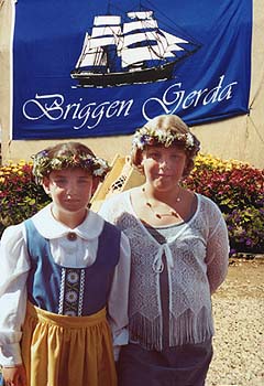 Seden bjuder att någon ur redarfamiljen är gudmor. Föreningen Briggen Gerda som är ägare, valde att låta lotten avgöra vilken flicka i 9 -10 års åldern bland föreningens medlemmar som skulle utses som gudmor. Lotten föll på Michaela Söderlund. Det stora intresset för Gerdaprojektet har resulterat i att allt fler med anknytning till "gamla Gerda" hör av sig. Det smått otroliga inträffar när man får veta om Annsofie Romare. Hon är nämligen barn i femte generationen efter Gerdas förste skeppare Johan Thorbjörnsson. Annsofie (folkdräkt)assisterade vid sjösättningen. Lite fakta om projektet Gerda och sjösättningen Långväga gäster: Seglandes från England kom "Atalante", skeppare Pat Fowler. Gäster ombord,influgna till sjösättningen var Kay Hardes, Danmark, Janet Hardes, USA och Lee New, England. Musik: Bomhus Manskör, Looking Back band, Furuviks ungdomsorkester. Flygvapnetsmusikkår, Operasångare Bengt Rundgren, Gävle. Lite historia: Briggen Gerda byggdes år 1868 på O A Brodins varv i Gävle.Det är 130 år sedan sista träskeppet byggdes i Gävle. Ägare och siste skeppare Pehr Olsson, Pataholm, gjorde sista resan upp tillGävle år 1936.Karin Jonsson, dotter till Pehr, och hennes son Sten-Olof Jonsson,Slakmörestrand startade en stödgrupp i Pataholm för Gerdaprojektet. De har varit till stor hjälp med anskaffandet av storvuxna ekar och lärkträd. Sten-Olof har tillsammans med lokalt bryggeri låtit framställa ett starköl samt ett bordsvatten: "Slagvatten".Inte nog med det, även en speciell korv tillverkas också. Nuvarande Gerda: Drivande krafter inom projektet är Åke Åberg, Lars Södergren och Henri Ollikkala. Christina Blomberg är deras "allt i allo" d.v.s. kvinnan bakom allt! Skeppsbyggare Egil Bergström, som hjälpte till i projektstarten, har sysslatmed skeppsbyggeri i 25 år. Han restauerade skonaren Linnea, vrakförklarad 1985, nu seglar hon i Västervik. Segelmakaren Jan koch, Svendborg i Danmark, hjälpte till med starten avsegelsömnaden i Söderhamn. 15 segel, - 625 kvadratmeter! Jovisst, dom är färdiga! Gerdas varv har själva tillverkat alla block, -380 st. Vattenlinjens längd är 33 meter. Lägger vi till bogsprötet blir det några centimeter kortare än 50 meter. Går du tvärs över Gerda-Gefle så är det 8,2 meter. Vill du se henne lägga till vid kajen med last, behövs det mer är 3.6 meters djup. Innan hon kom till kajen kan hon ha gjort en 12 knop för segel eller c:a 8 för motor. Det gör hon med hjälp av en marindiesel på 550 Hkr. För att hon ska gå stadigt läggs det i en ballast på en 180 ton.Hela Gerda-Gefle i sjön betyder att 350 ton vatten flyttar på sig. Kallasför deplacement. Tittar du uppåt så är det 30 meter innan stormasten tar slut. Sjöfartsverket är med och kollar bygget. Så småningom kommer klassningen att ske. Gerda-Gefle kommer att ta passagerare. Uppåt ett 80-tal får plats och att det kommer att bjudas en förstklassig komfort kan ni vara övertygade om. Däcksplankorna av Oregeon Pine inporteras från Amerika, och du kan få "köpa in" en eller flera plankor. Ditt namn blir historiskt! Besök hemsidan: www.briggengerda.com Starta om --> |