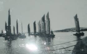 Endast en båt lyckades ta sig seglande och segrande i mål! Inte gick det fort inte... ( Bilden visar bogserade garnbåtar c:a 1905)